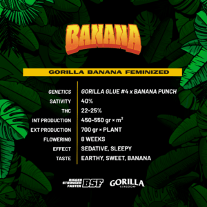 Though easy to grow, the Gorilla Banana Feminized tends to be more sensitive during the early weeks of life until a good root system is developed. Therefore, it is advisable not to overfertilize. After the first weeks, she will turn into a strong plant, resistant to any kind of pruning.