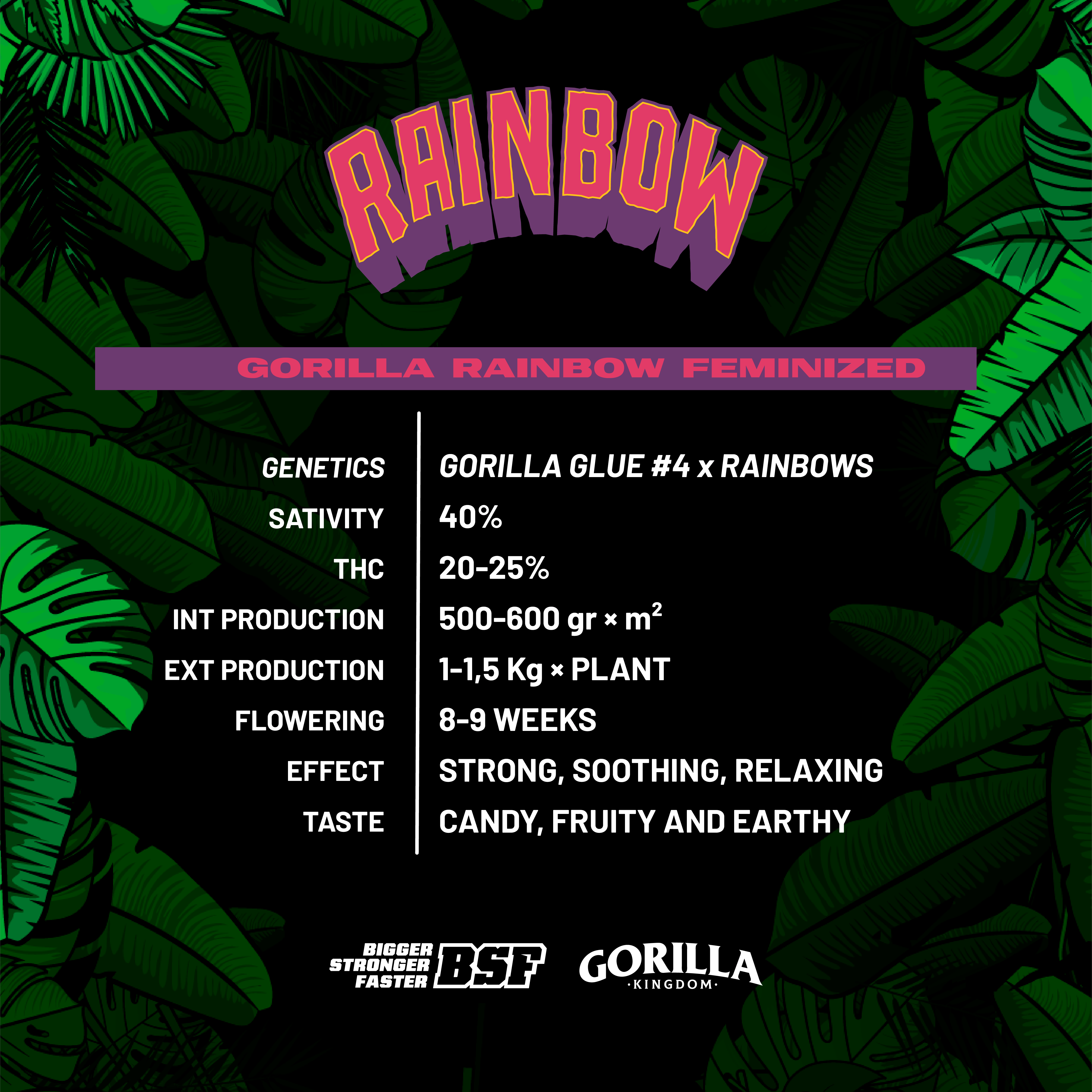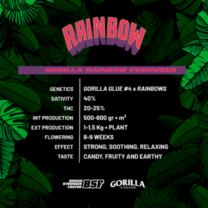 The unique Gorilla Rainbow Fem flavor is sweet and fruity, with soft touches of caramel. She has a strong, long-lasting effect, ideal for indica lovers looking for calm and relaxing moments.