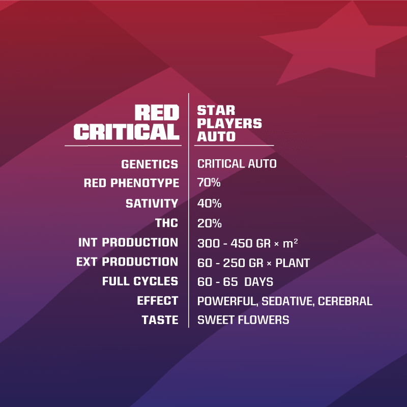 Red Critical Auto has a strong sweet floral aroma very pleasant to the palate, which combines perfectly with a powerful cerebral high, which leads to a very pleasant sensation of relaxation.